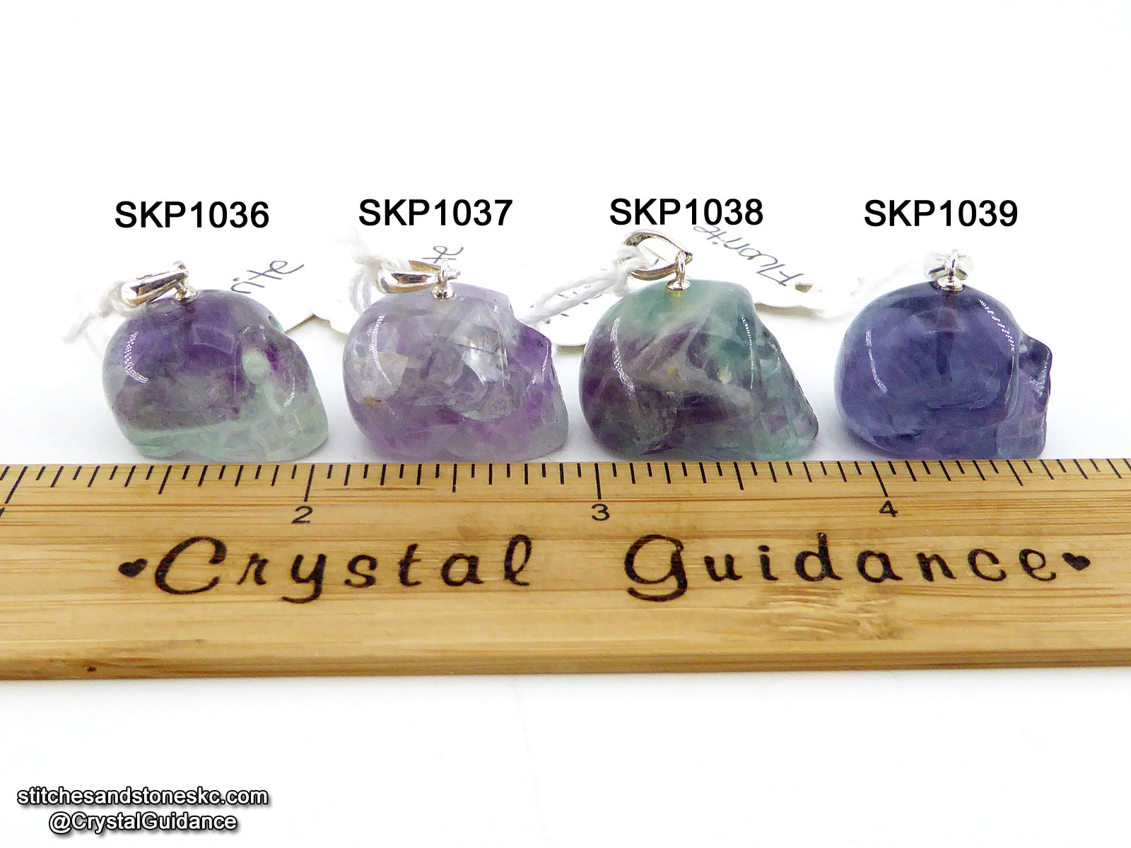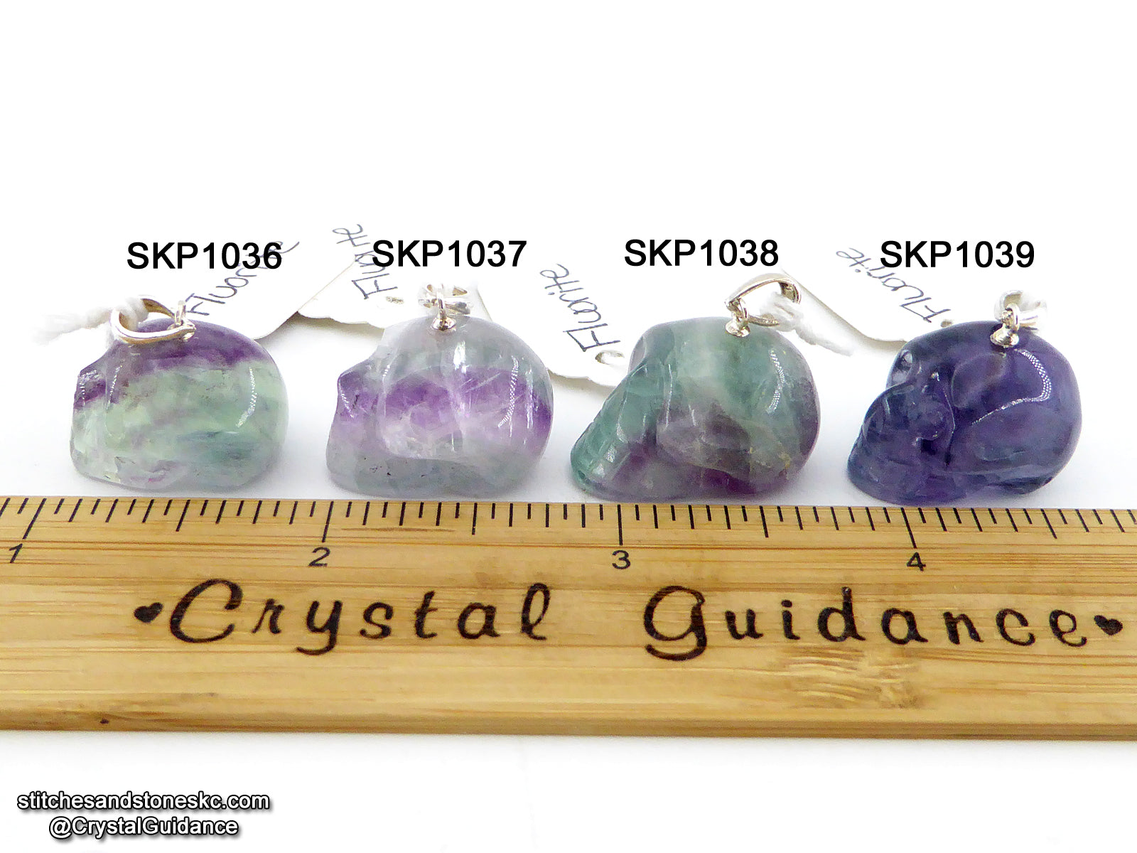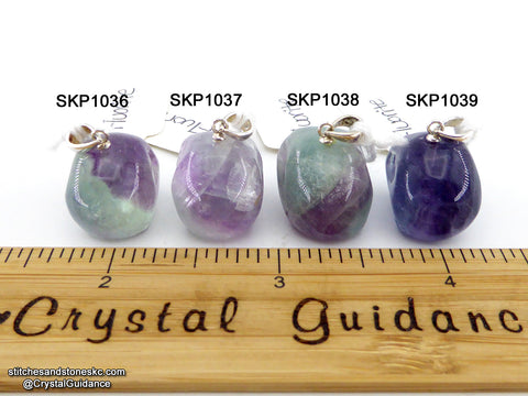 This listing is for a QUANTITY of 1 (ONE) Fluorite crystal skull pendant with sterling silver bail. You will receive the exact crystal of your choosing that is shown in the photos. [This item has free US shipping.]