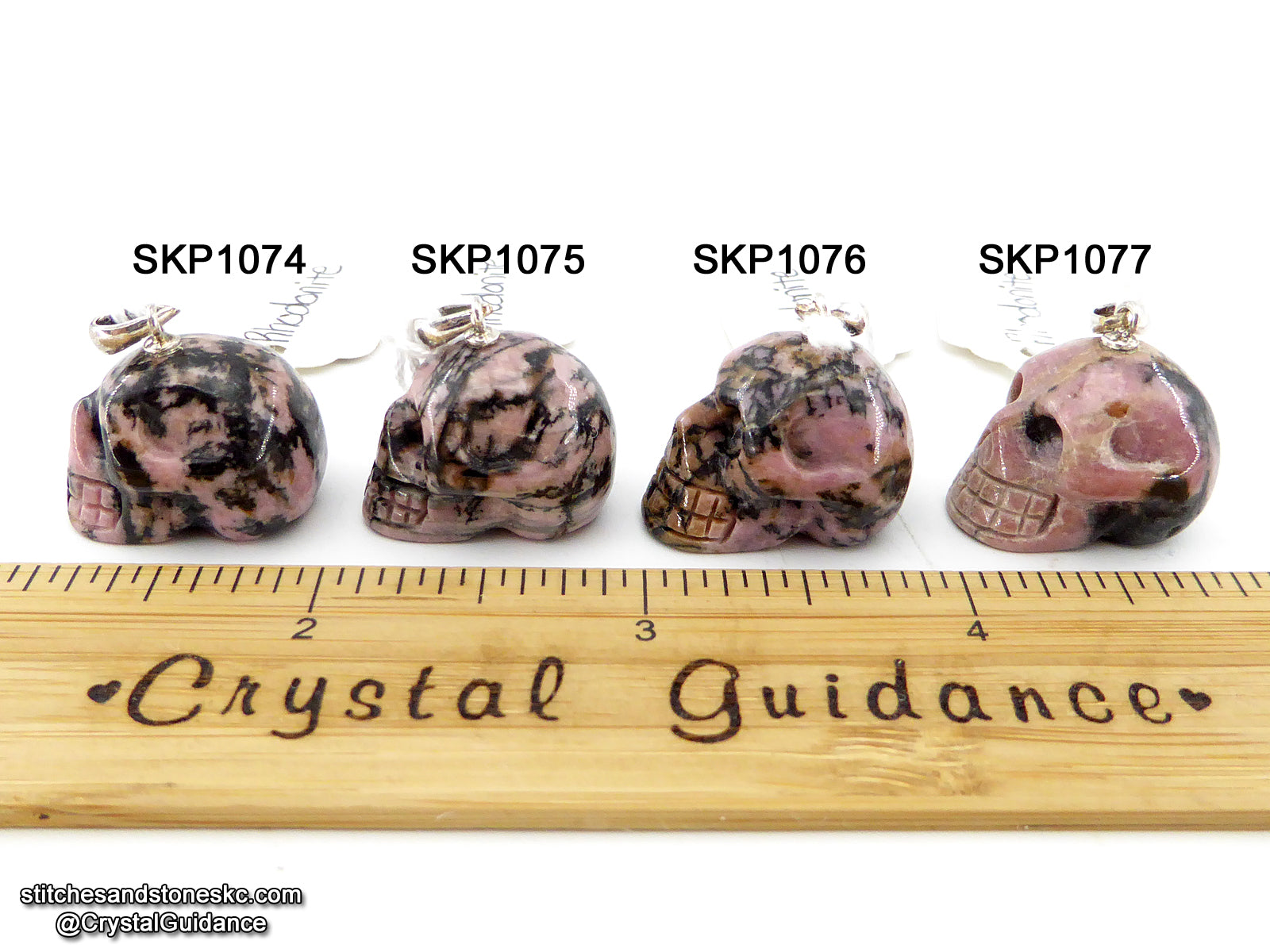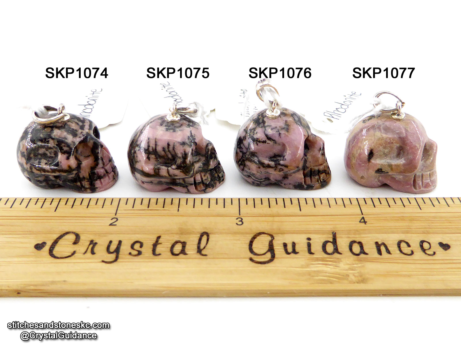This listing is for a QUANTITY of 1 (ONE) Rhodonite crystal skull pendant with sterling silver bail. You will receive the exact crystal of your choosing that is shown in the photos. [This item has free US shipping.]